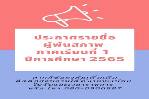 ประกาศรายชื่อผู้พ้นสภาพ ภาคเรียนที่ 1 ปีการศึกษา 2565 1. พ้นสภาพเนื่องจากขาดคุณสมบัติ อ่านต่อ