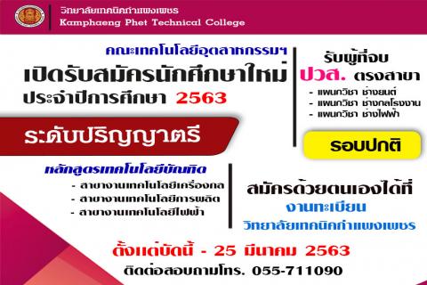 รับสมัครนักศึกษาใหม่ ปีการศึกษา 2563 ระดับปริญญาตรีสายเทคโนโลยีหรือสายปฏิบัติการ (ต่อเนื่อง) อ่านต่อ